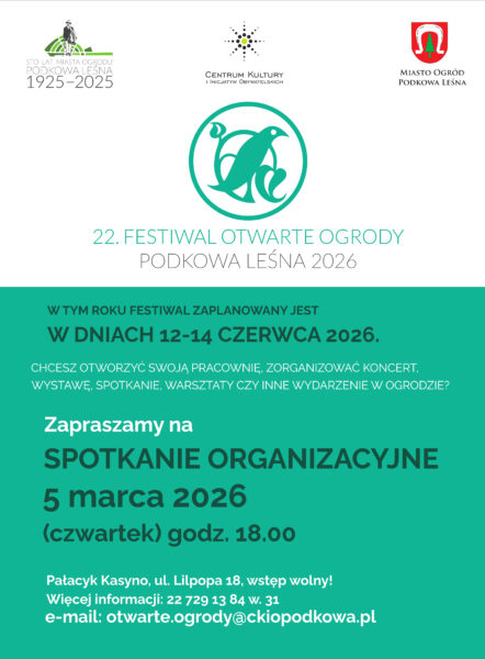 W czwartek 5 marca zapraszamy na spotkanie organizacyjne związane z 22 edycją Festiwalu Otwarte Ogrody, która odbędzie się w Podkowie Leśnej w dniach 12-14 czerwca