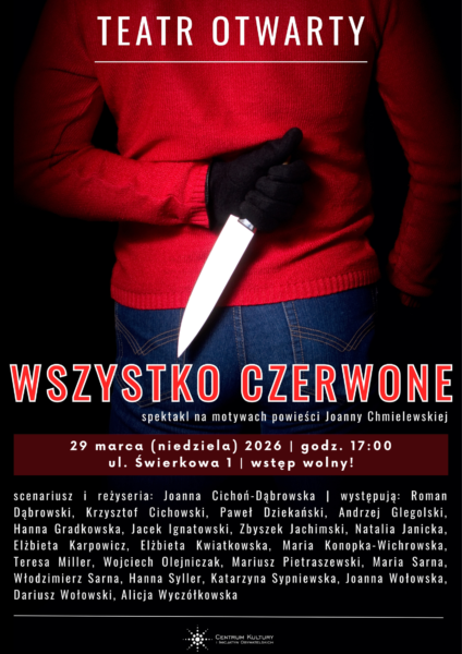 Zapraszamy na spektakl „Wszystko czerwone” na podstawie powieści Joanny Chmielewskiej. Reżyseruje Joanna Cichoń-Dąbrowska. Po raz trzeci na scenie na Świerkowej zobaczymy cały zespół Teatru Otwartego