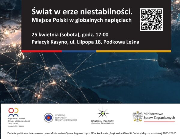 W sobotę 25 kwietnia zapraszamy do Pałacyku Kasyno na debatę „Świat w erze niestabilności. Miejsce Polski w globalnych napięciach”. Udział w niej wezmą, dyplomata Adam