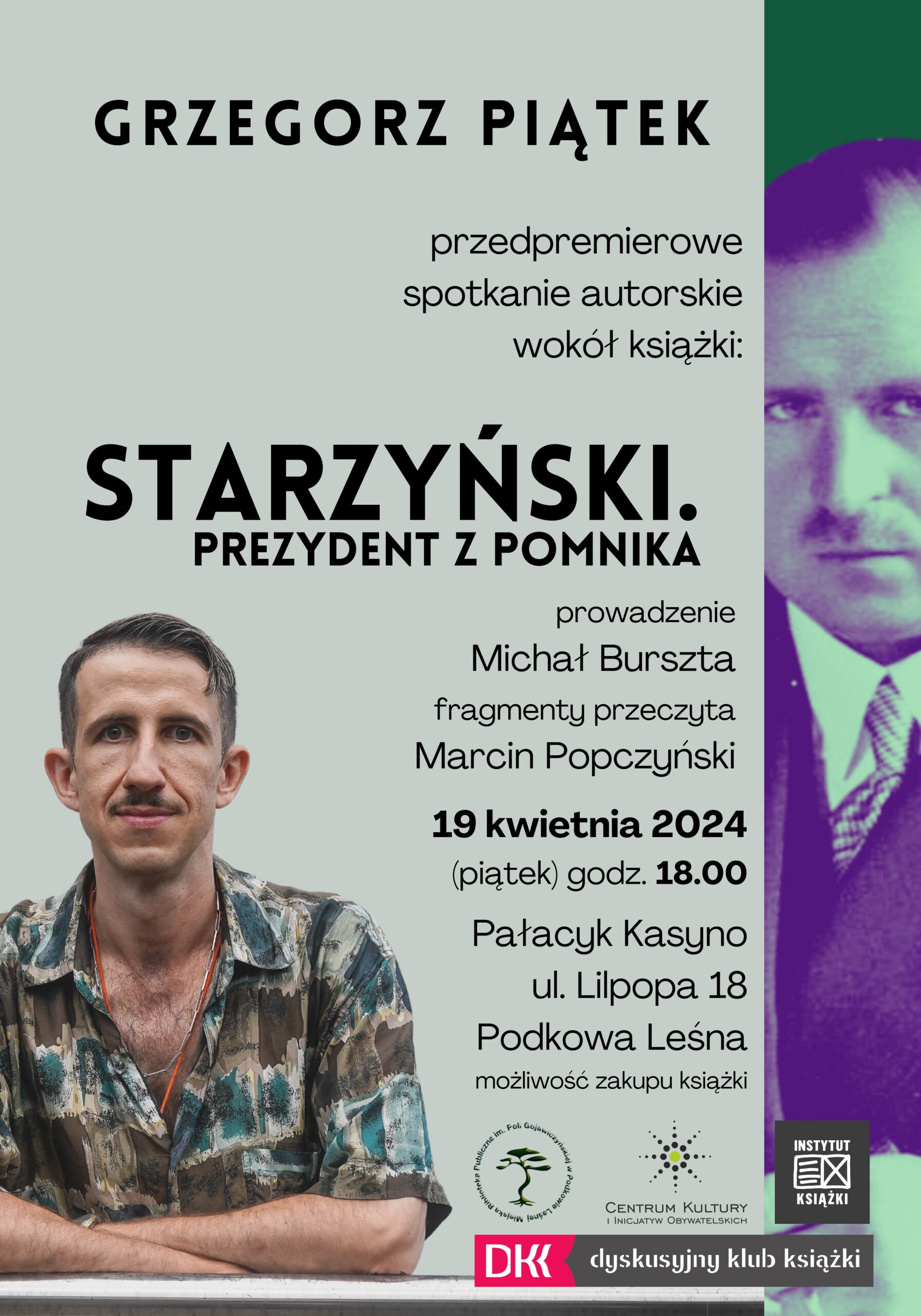 CKiIO we współpracy z Miejską Biblioteką Publiczną im. Poli Gojawiczyńskiej zapraszają na spotkanie z pisarzem, architektem, historykiem architektury Grzegorzem Piątkiem wokół nowego, zmienionego wydania jego książki „Starzyński. Prezydent z pomnika” poświęconej prezydentowi Warszawy Stefanowi Starzyńskiemu, postaci niejednoznacznej, w przypadku której mit bohaterskiej śmierci przesłonił inne aspekty jej działalności.